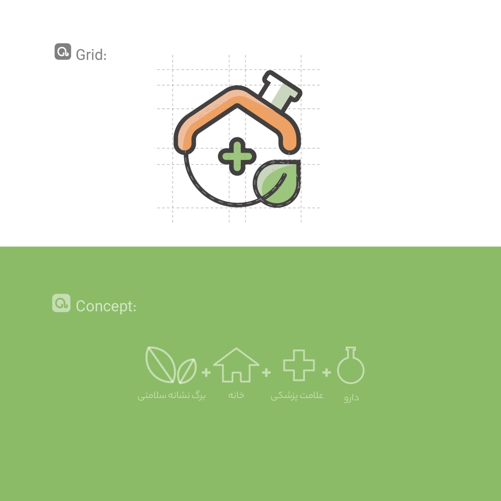 🔹 درون خانه، نماد به‌اضافه‌ی سبز رنگ به‌عنوان سمبل پزشکی و سلامت قرار گرفته تا هویت اصلی برند را به‌طور شفاف معرفی کند.