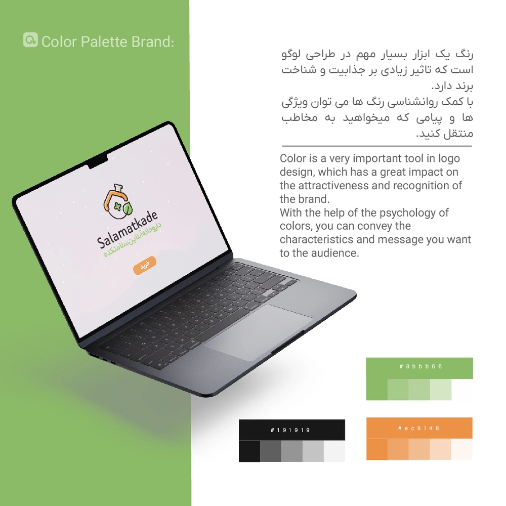 🔹 ترکیب یک برگ سبز در طراحی، یادآور درمان‌های طبیعی و رویکرد سلامت‌محور برند است.