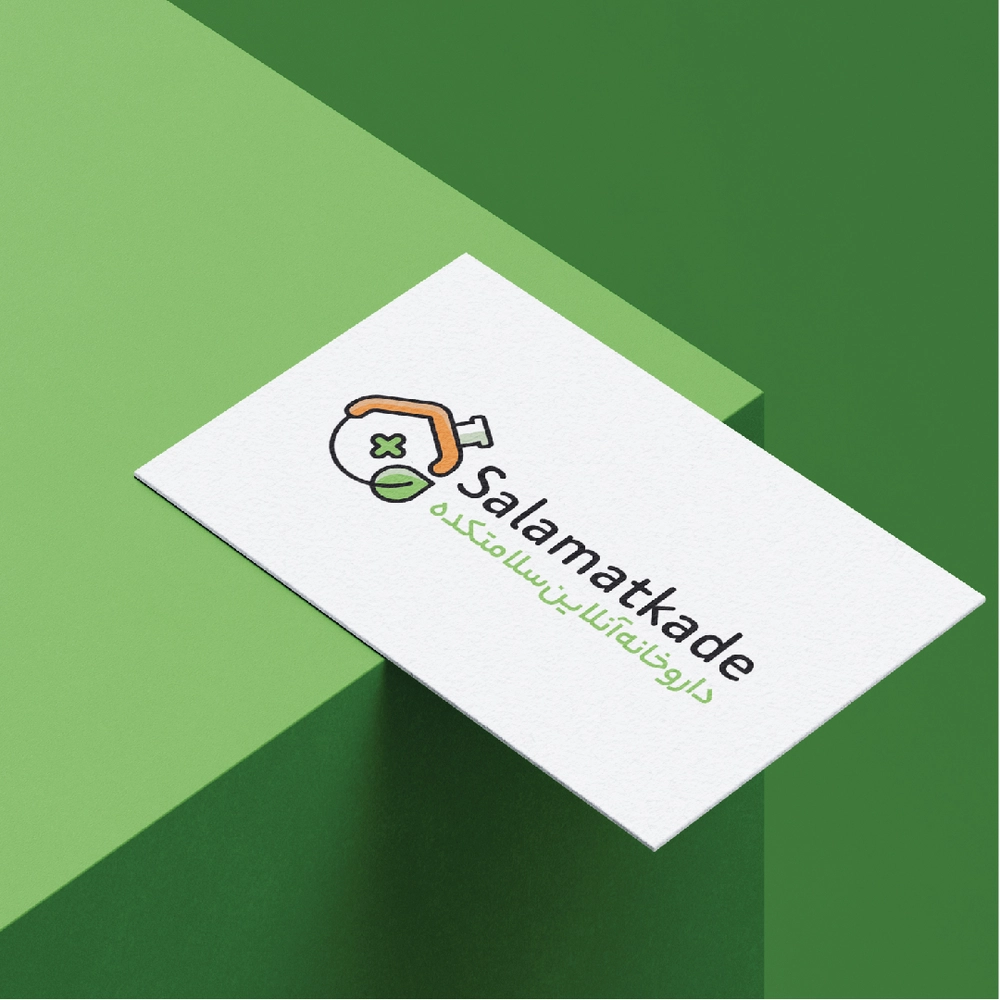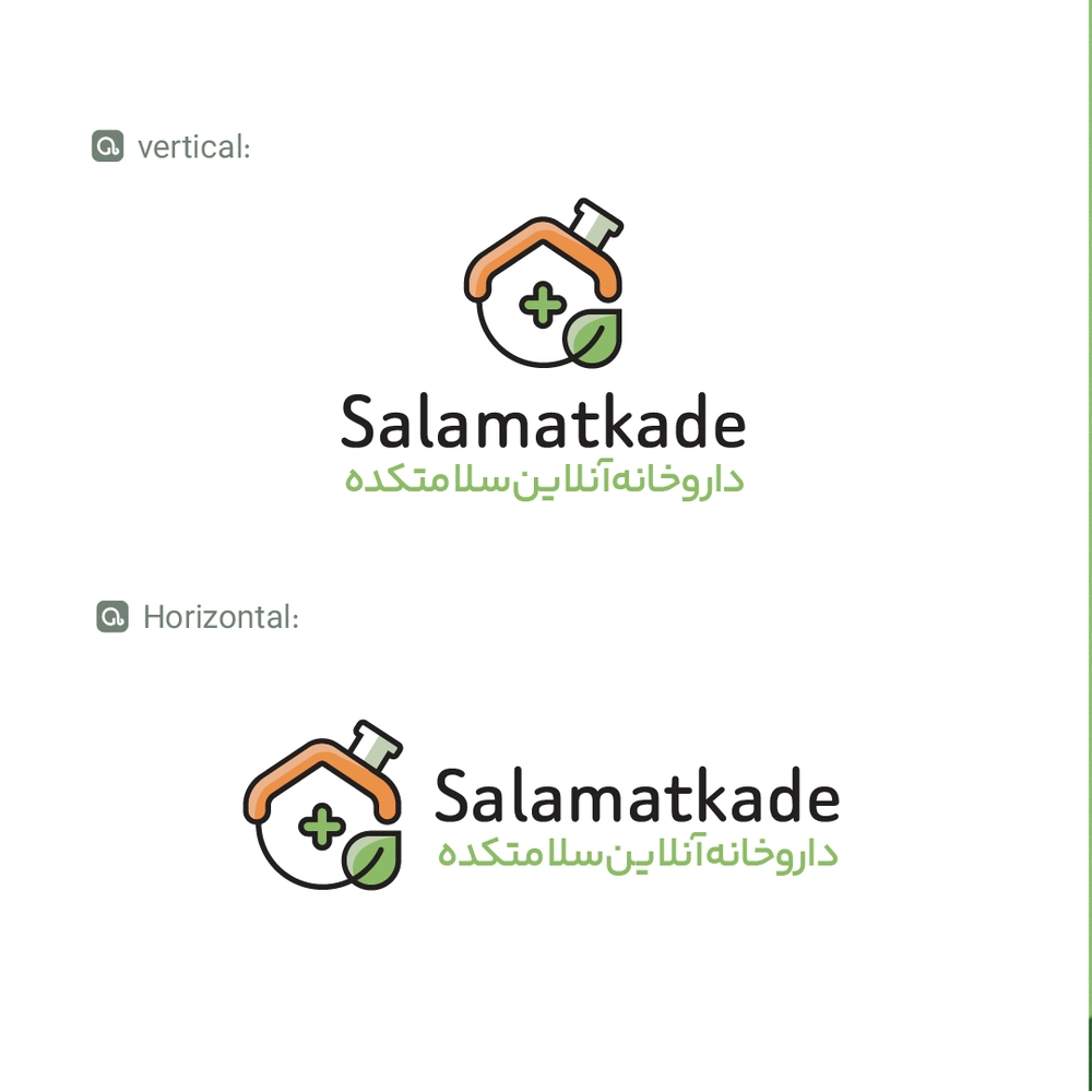 🔹 در بخش پایین لوگو، نام برند به‌صورت تایپوگرافی انگلیسی “Salamatkadeh” درج شده و در قسمت زیرین آن، عبارت فارسی “داروخانه آنلاین سلامت کده” برای تأکید بر فعالیت تخصصی مجموعه اضافه شده است.